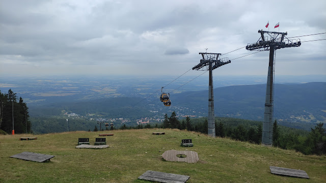 Wracam na stronę polską, trzymam się znaków zielonych i schodzę w dół. Na skrzyżowaniu ze szlakiem czarnym odbijam w lewo i jestem na Czerniawskiej Kopie 769m. Tutaj też zlokalizowana jest Wieża Widokowa. Tym razem widoki lepsze, chociaż pogoda "w kratkę".