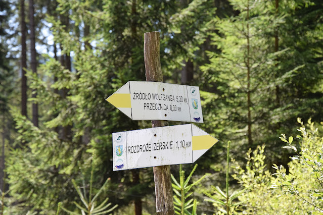 Wycieczka nr 2 z pobytu na wczasach w Świeradowie Zdroju. Dzisiejszy wypad ma na celu zdobycie 2 szczytów do Korony Gór Izerskich (KZKG): Kamienicy 973m i Jastrzębca 792m. Pierwszy z nich zlokalizowany jest poza wszelkimi szlakami (kiedyś biegł w jego pobliżu szlak żółty - ale obecnie jest zlikwidowany, po drodze widać jeszcze ledwo widoczne stare oznaczenia) i wchodząc na niego łamie się zakaz wejścia 😀, prawdopodobnie związany z wycinką lasu, więc niezbyt się nim przejmuje. Samochodem dojeżdżam na bardzo duży darmowy parking zlokalizowany na Rozdrożu Izerskim. Oglądam szlakowskazy i ruszam nieoznaczoną ścieżką w kierunku Kamienicy 792m.