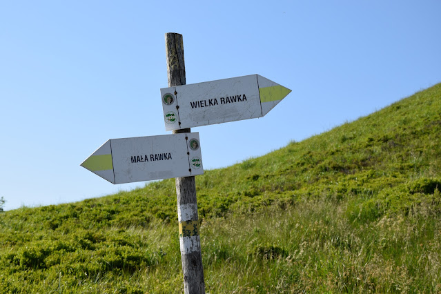 Zatrzymuję się przy schronisku dosłownie na chwilę i idę dalej. Szlak idzie ostro w górę przez las aż do szczytu Małej Rawki 1272m. Tuż przed szczytem wchodzimy na Połoninę i ... jest pięknie widokowo. Zdecydowanie widokowo najładniej jest w Tatrach i w Bieszczadach.