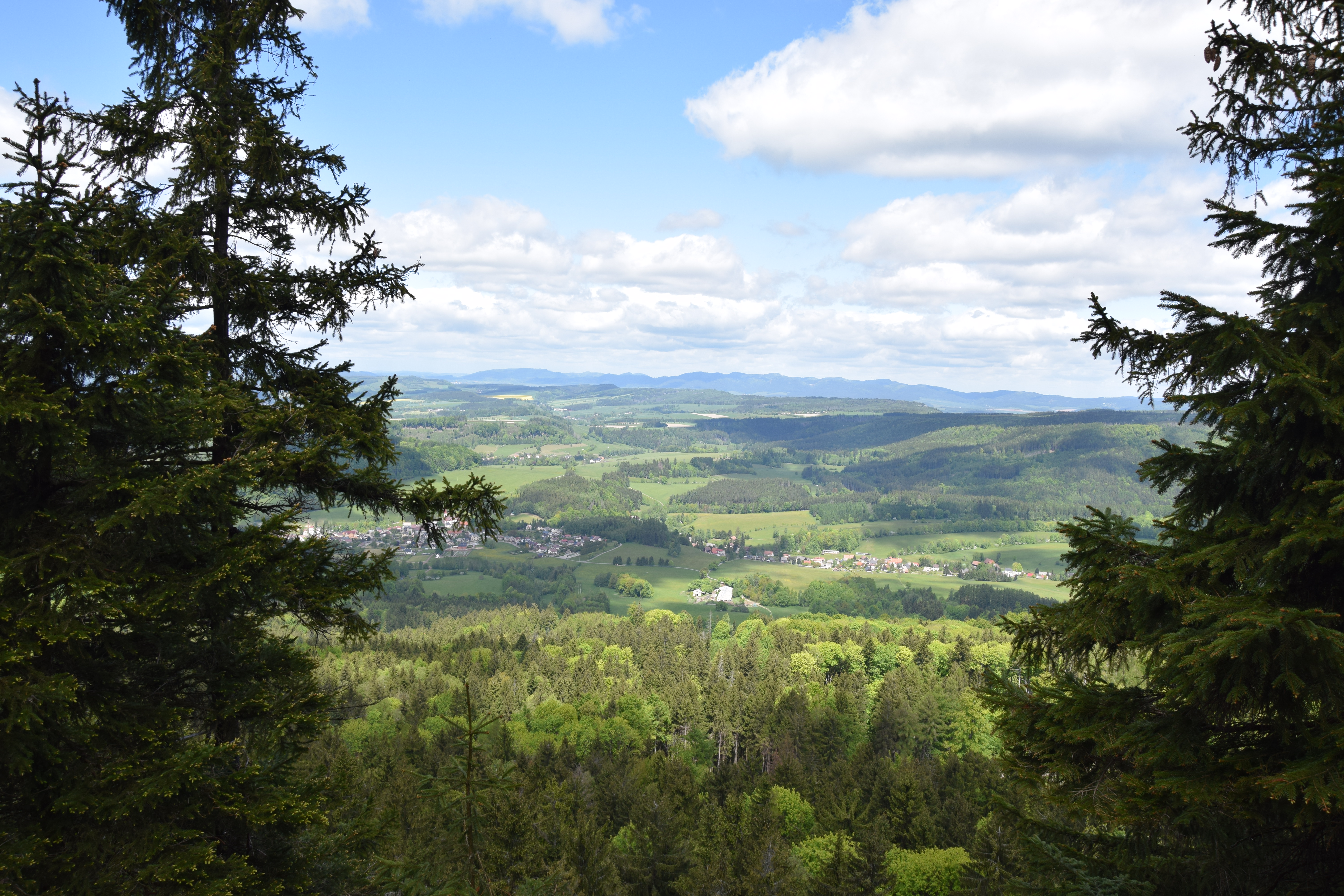 Schodzę w dół, mijam wiatę turystyczną, na najbliższym skrzyżowaniu szlaków zmieniam kolor szlaku na czarny. Dochodzę do Solnej Jamy 578m i skrzyżowania z niebieskim szlakiem. Samą Solną Jamę nie odwiedzam, znowu zależy mi bardzo na czasie, ażeby zdążyć na pociąg do Międzylesia. Niebieskim szlakiem idę w kierunku wioski Różanka, tuż przed nią fajne widoki.