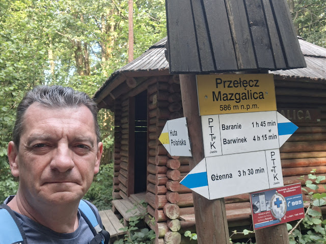 Kontynuacja wędrówki szlakiem karpackim ciąg dalszy. Dzisiaj samochodem jadę najpierw asfaltem a później kamieniami 😀do Schroniska Hajstra. W okolicach schroniska jest trochę samochodów (w końcu weekend) oraz niewielkie pole namiotowe, na którym zwolennicy biwakowania znaleźli swoje miejsce. Parkuję na poboczu tuż za schroniskiem. Kamienistą drogą na początek, później trochę polanami i w końcu wchodzę w las. Szlak w sposób dość nudny trochę pnie się powoli w górę. Mijam granicę Magurskiego Parku Narodowego i po niewielkiej wspinaczce staję na granicy ze Słowacją na Przełęczy Mazgalica 585m. Na Przełęczy stoi dość ładna wiata turystyczna, ławeczka, jest miejsce gdzie odpocząć. Widzę pomiędzy drzewami w niewielkiej oddali śpi jeszcze jakiś turysta na hamaku rozwieszonym między drzewami. To dość ciekawa opcja, znacznie łatwiejsza od namiotu, ale nigdy nie miałem odwagi jej popróbować.